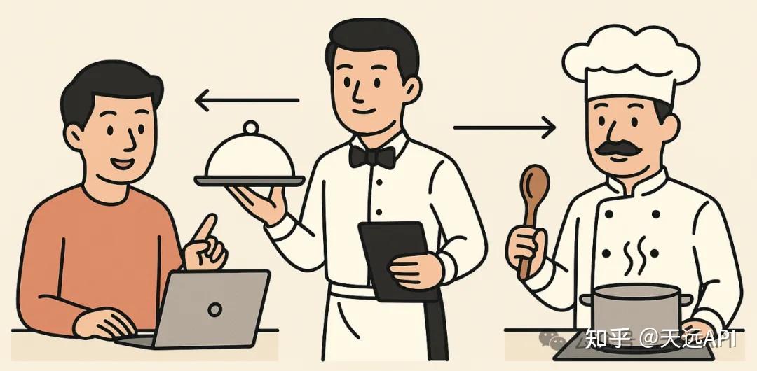 - 服务员(API)把需求传给厨房(后端/服务器)