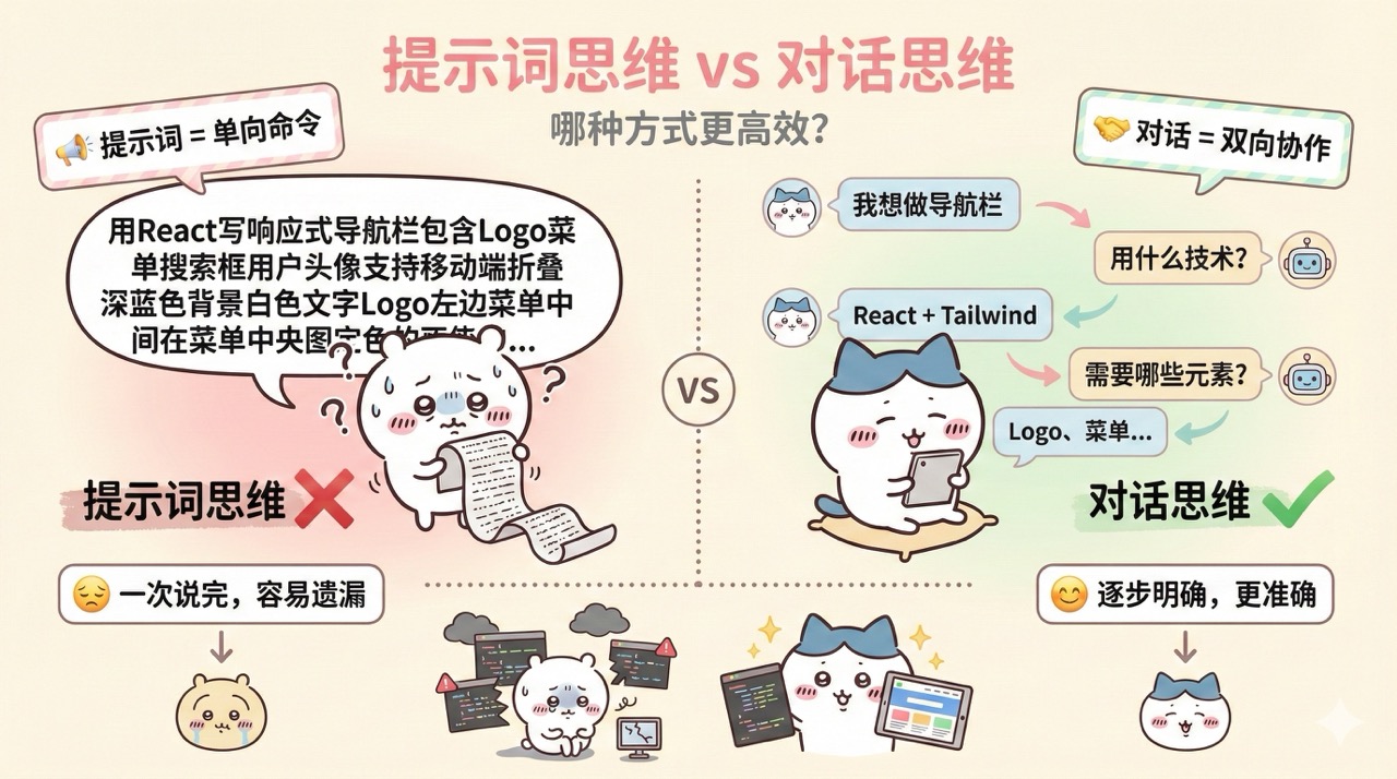 对话工程是 Vibe Coding 中最重要的技能之一。它不是简单地"写提示词",而是一个持续的、双向的、迭代的交流过程。